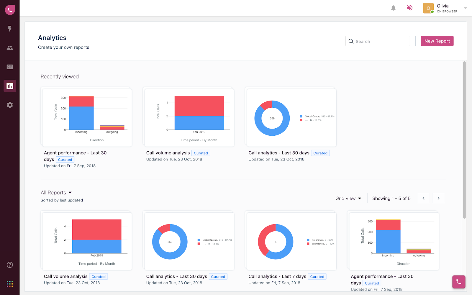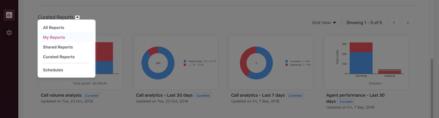 - Curated Reports: A set of five default reports that are curated to give you the most required data for any call center.